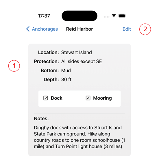 - Edit: Clicking this button brings up an editor screen so you can make changes to the entered data. The edit screen is identical to the New Anchorage screen.