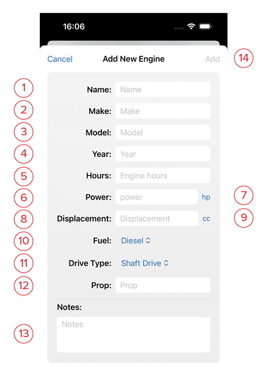 When you click on the add new engine icon from the Vessel Details view, this page slides up from the bottom of the screen: