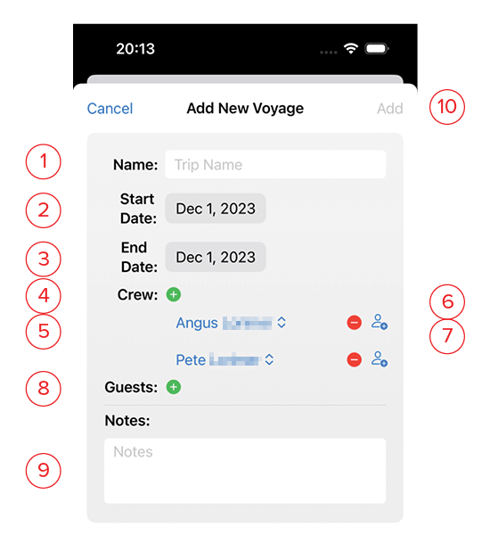 8. Guests: Click on the green + symbol to add guests to this voyage.