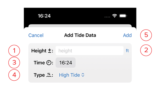 - Unit: If local tide tables are published in a unit other than your your customary units, you may change that here by clicking on the blue unit indicator. Choose from the following in the drop-down list: Meters, Feet, Fathoms.